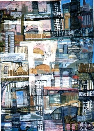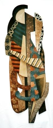 "Nelson Dias-Lopes a suivi une formation d’architecte et de peintre. Son évolution est un va-et-vient constant entre des œuvres en aplat (collages ou peintures) et des œuvres en relief. Ses premières réalisations (1984) représentent des collages de papiers anciens, choisis méticuleusement en fonction de leurs couleurs, leurs motifs, et même leur grain, puisqu’il utilisait aussi du papier craft. Découpés, puis collés et peints, ces papiers forment une composition abstraite, harmonie de formes et de couleurs. A l’occasion, Nelson Dias-Lopes utilise la technique du pochoir pour “imprimer” des lettres, sans rapport entre elles, par-dessus la composition de papiers collés. Ces lettres n’ont pas de sens, ne forment - à priori - pas de mots, mais sont choisies simplement pour l’arabesque qu’elles constituent. Détail significatif, ces lettres sont des lettres d’imprimerie entrecoupées : le “S” est en trois parties, le “R” est interrompu deux fois…. Bref ! Elles sont à elles seules des collages “automatiques”. Puis Nelson Dias-Lopes abandonne les papiers collés pour la peinture. Cependant ses compositions gardent l’apparence de collages : le peintre imite les papiers, inventant leurs motifs et leurs couleurs. On est encore dans l’aplat.