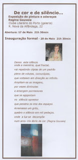 Passados três anos regresso ao Clube Literário com a exposição De cor e de silêncio, que consta de trabalhos em pastel e em óleo, para além de acrílicos e aguarelas.