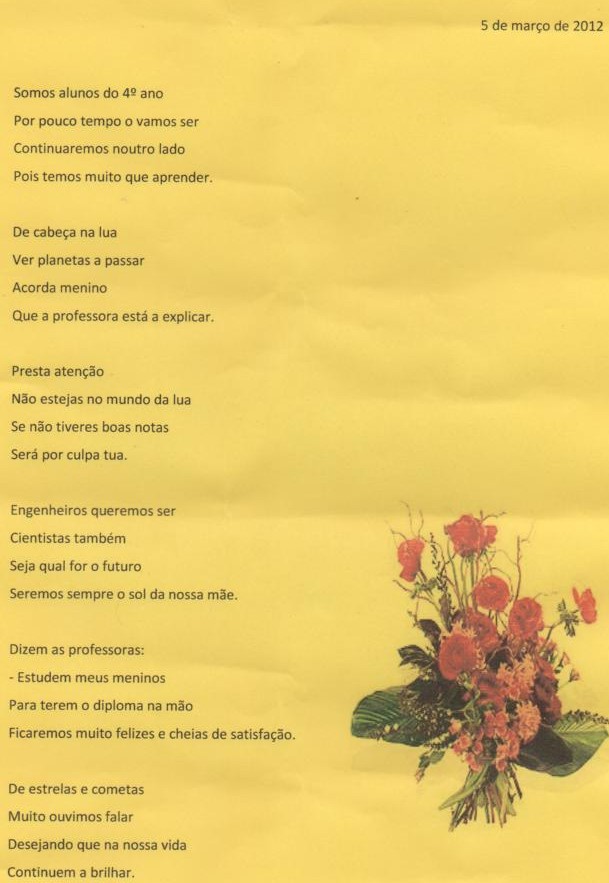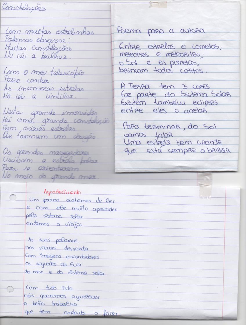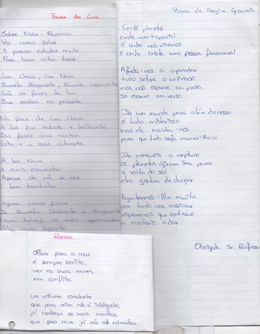uma entrevista, poemas feitos por grupos de alunos.