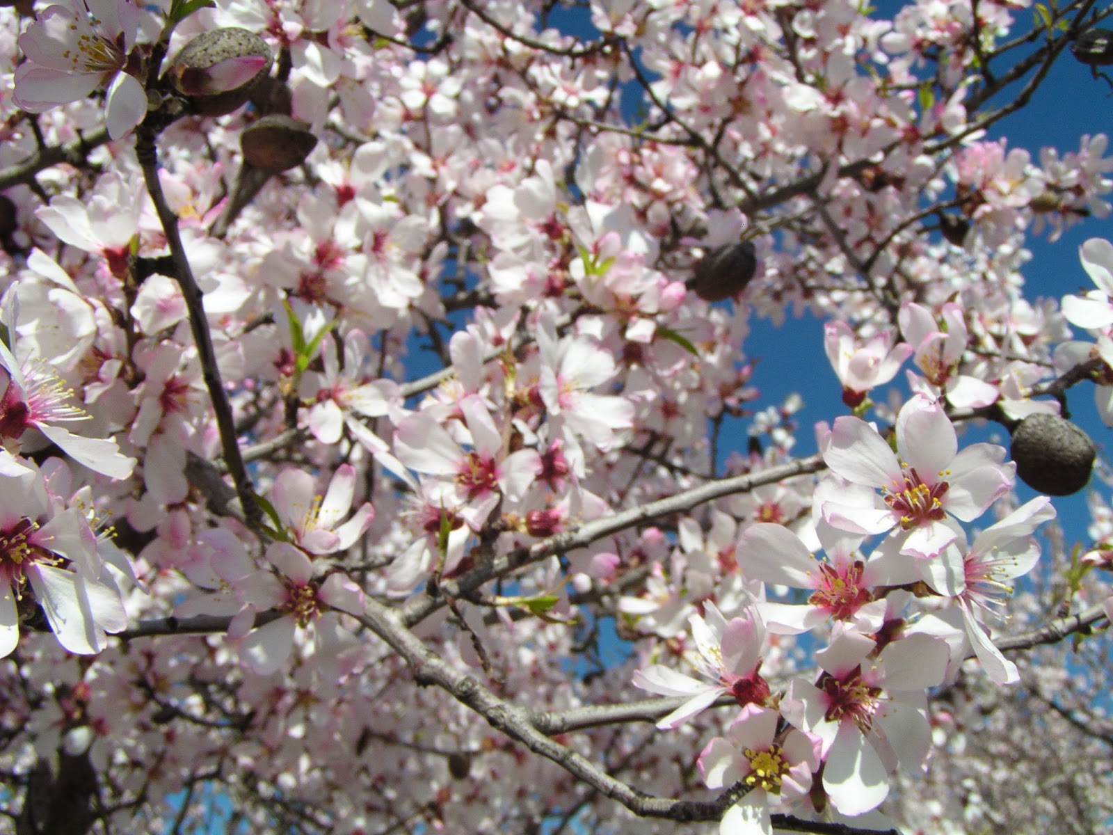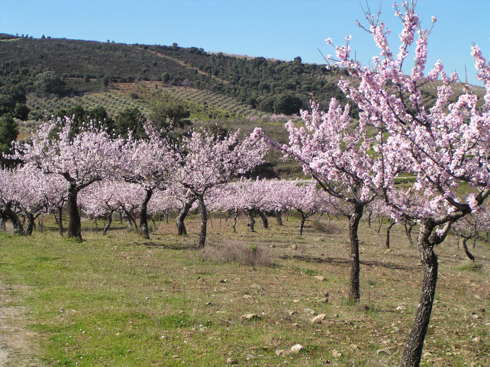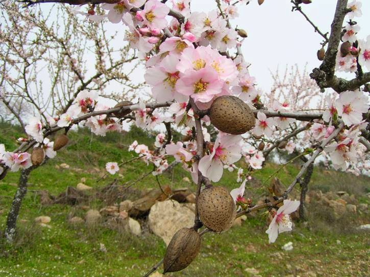 vista de longe e algumas imagens de amendoeiras floridas.