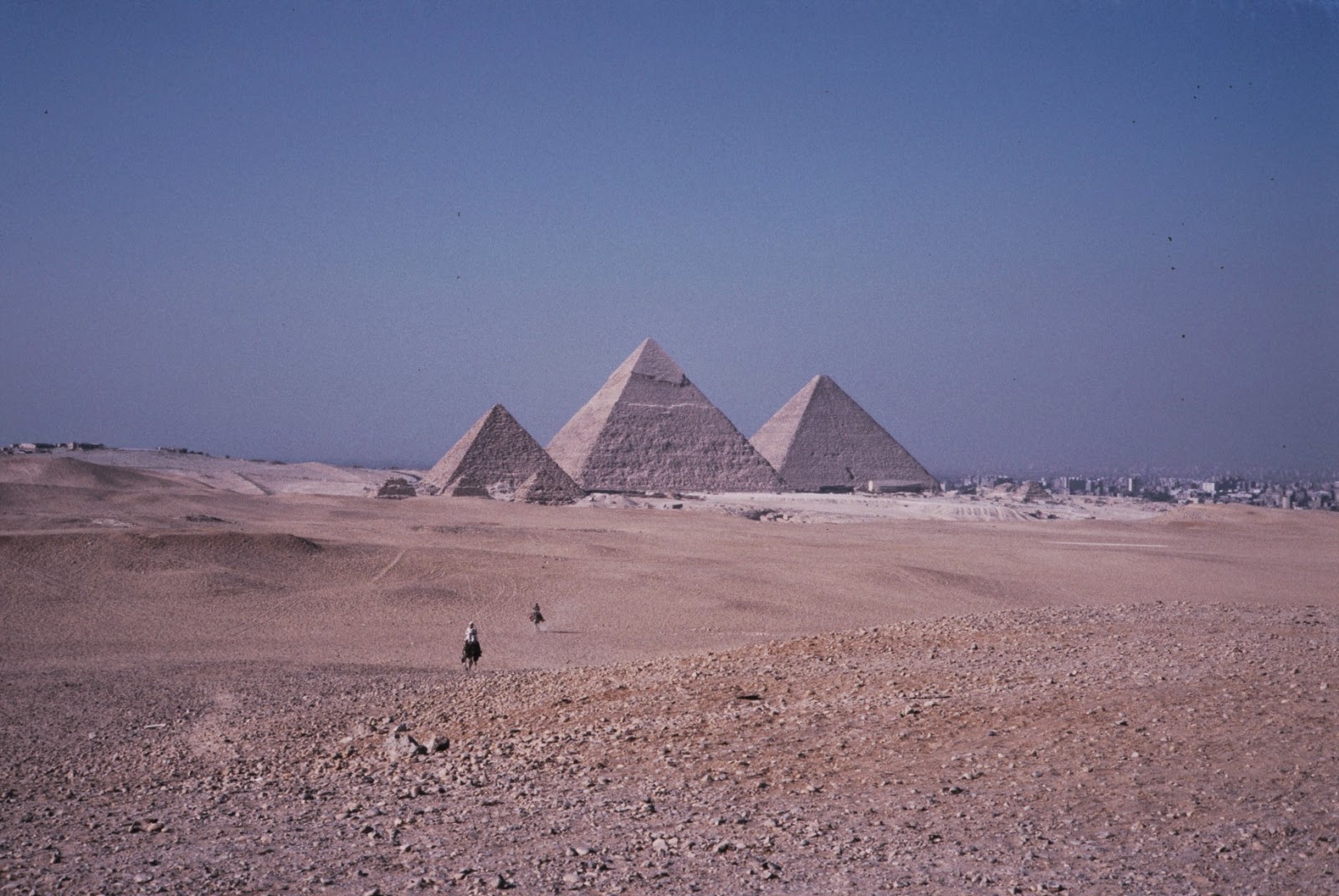 A do meio, Pirâmide de Kefren, parece maior mas não o é. À esquerda podemos ver a de Mikerinos e à direita a de Keops, a maior de todas. As fotos que seguem foram aí tiradas
