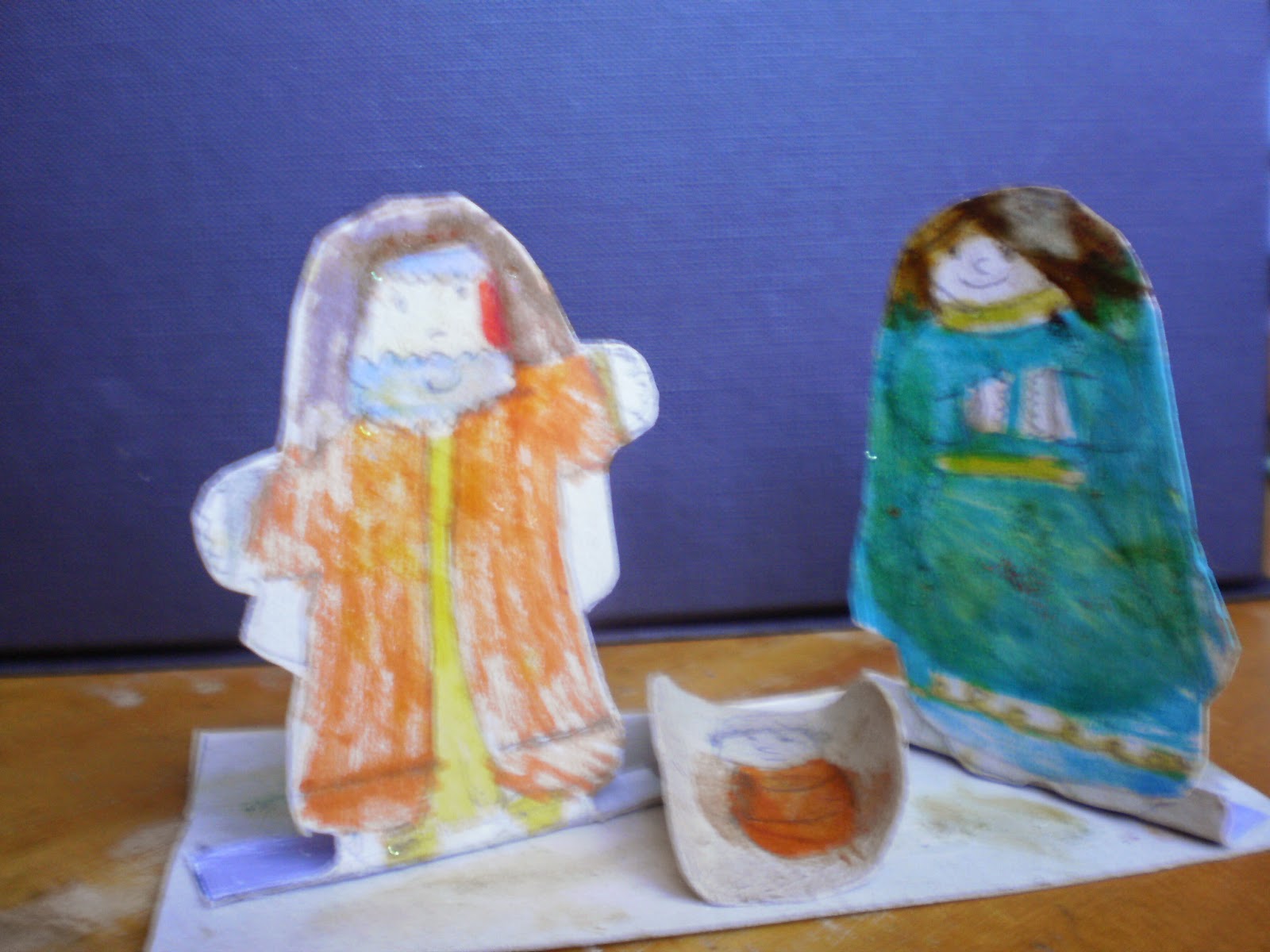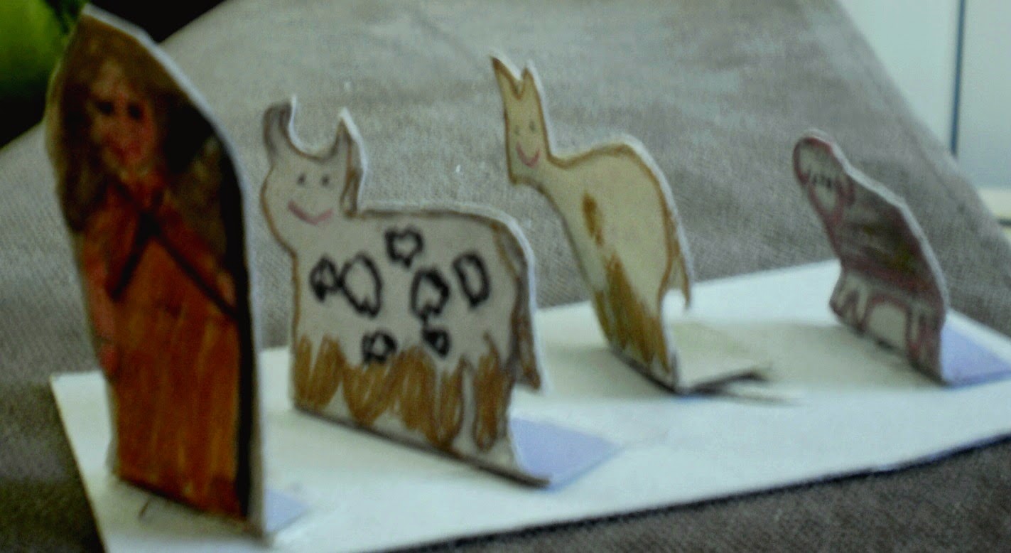 E virando-se para mim, disse-me: faz-me um molde para o burro. Em papel fiz o molde, a partir do qual ele fez o desenho em cartão. Cortou com a minha ajuda, pintou, dobrou e colou na base.