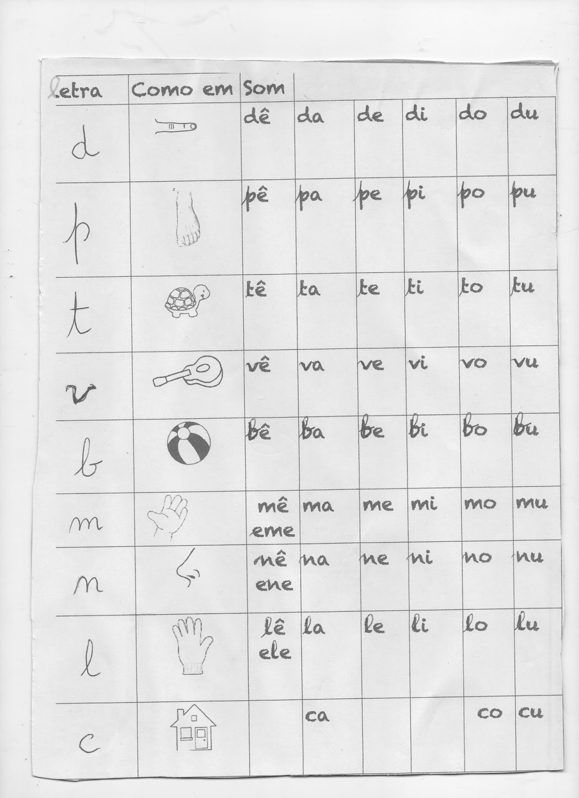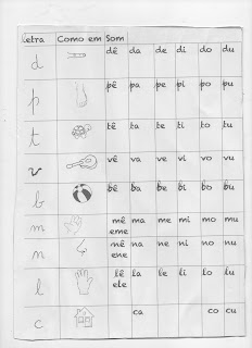 Andava um pouco triste porque alguns colegas já liam e escreviam melhor que ela. Apercebi-me que a dificuldade residia em não associar o som das consoantes às letras. Resolvi “criar” uma “cábula” para ajudar, tendo em conta palavras que ela já conhecia bem. Funcionou lindamente.